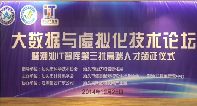 由汕头市信息服务和软件行业协会、汕头市计算机学会、潮汕IT智库主办的“大数据与虚拟化技术论坛暨潮汕IT智库第三批高端人才表彰仪式----IT智库带你走进专业课堂”于2014年12月25日下午在汕头市高新区物联网产业园顺利举行。借圣诞节的喜气,来自我们粤东区党政机关、企事业单位的信息化的负责人、IT技术负责人、粤东区各机关院校信息化负责人、潮州揭阳友好协会各负责人、潮汕IT智库高端人才欢聚一堂,共同了解专家带来最前沿、最权威的大数据虚拟化资讯。