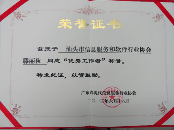 会议上还表彰了年度优秀工作者。我协会滕丽秋副秘书长凭借在协会工作中出色的工作能力和积极的工作态度,以及2012年协助省协会推进ICT论坛,得到省协会的充分认可,荣获“优秀工作者”荣誉称号,特此表示祝贺。