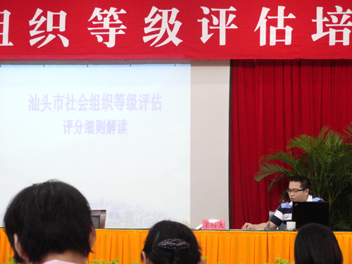 2012年8月24日下午,协会秘书处派员参加由市民政局在汕头宾馆召开的全市社会组织等级评估培训班。培训班由市民政局党组副书记、市社会组织管理局局长张云良作动员讲话,并对评估工作进行全面部署。汕头市装饰行业协会秘书长王穗介绍了评估工作经验,市社会组织管理局林玮就评分细则作详细的解读。全市行业协会、公益性、专业性、学术性80多个社会组织100多人参加了培训。