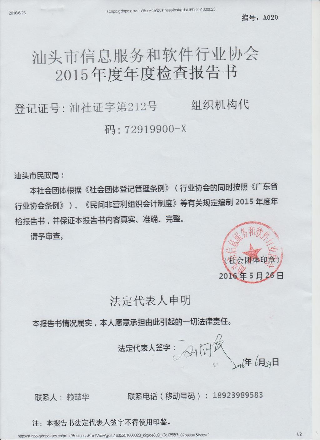 汕头市信息服务和软件行业协会2015年度年检合格