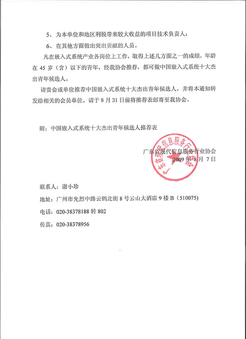 评选中国嵌入式系统十大杰出青年的推荐表.