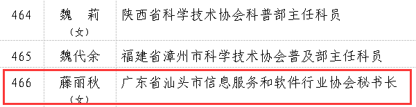 能获此殊荣,与滕丽秋秘书长一直以来辛勤的付出是分不开的。滕秘书长自2011年1月至今,担任汕头市信息服务和软件行业协会的全职秘书长、汕头市高新企业协会兼职副秘书长、汕头市计算机学会理事,一直专心致力于汕头科技信息服务工作。在市科协的领导下,紧密结合行业协会的特点,紧紧围绕“提升学会能力,主动服务生产”主题开展工作,着力推动本地的信息化发展进度,促成19家汕头企业获得省两化融合贯标试点企业、培育53家会员成为高新技术企业、推动行业企业9家成立企业科协、配合中国科协海智计划推动本地科技发展进程;成功打造 “潮汕IT智库”高端人才品牌活动,为促进汕潮揭一体化发展进程作出贡献。曾带领行业协会先后获得中国社会组织等级评估AAAAA级优秀社团、广东省现代服务业优秀单位、汕头市科学技术协会的先进单位、汕头市社会组织示范单位等荣誉。个人曾荣获2013年广东省现代信息服务行业协会“优秀工作者”、2015年广东省行业协会联合会“广东省优秀秘书长”称号。