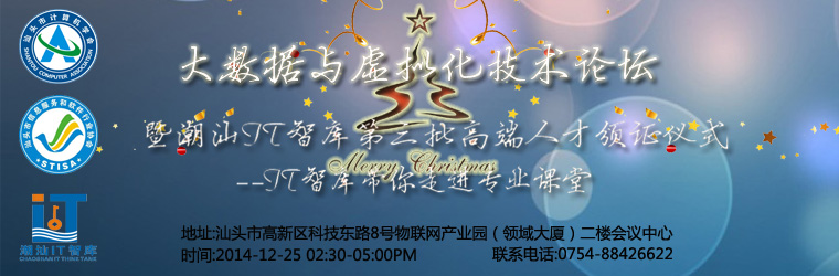 由汕头市信息服务和软件行业协会、汕头市计算机学会、潮汕IT智库主办的“大数据与虚拟化技术论坛暨潮汕IT智库第三批高端人才颁证仪式--IT智库带你走进专业课堂”将于12月25日(明天)下午在汕头市高新区物联网产业园举行。届时,将邀请行业专家给您带来最前沿、最权威的大数据虚拟化资讯。诚邀您参加此次活动。