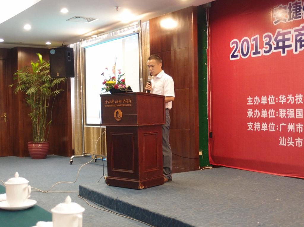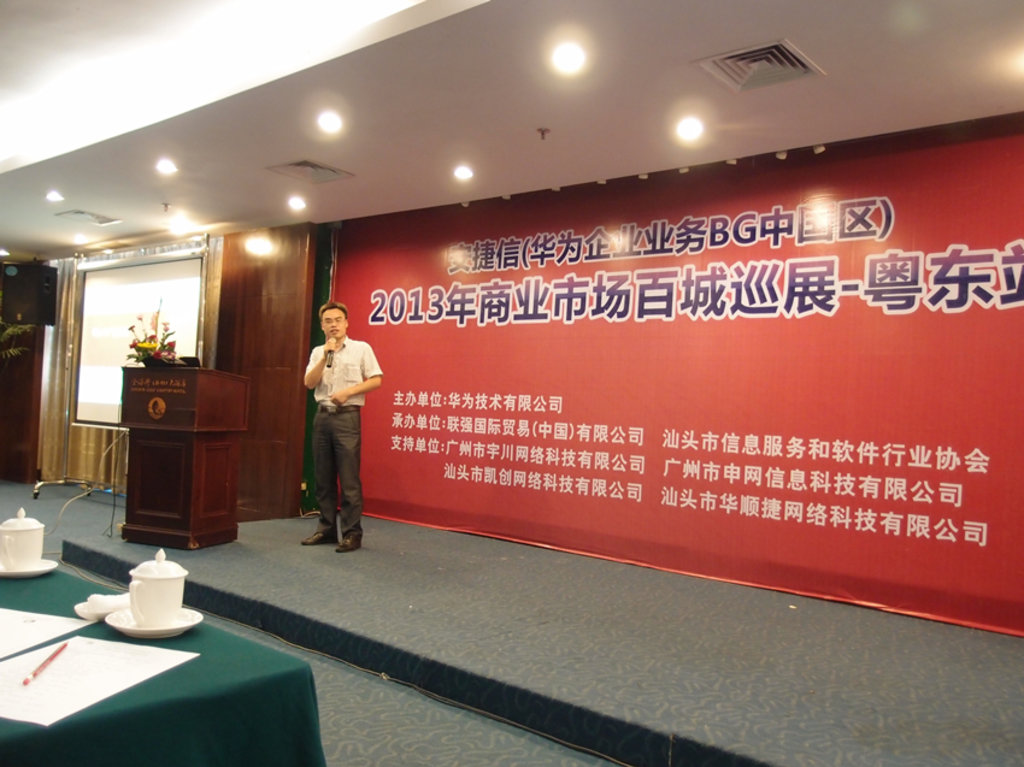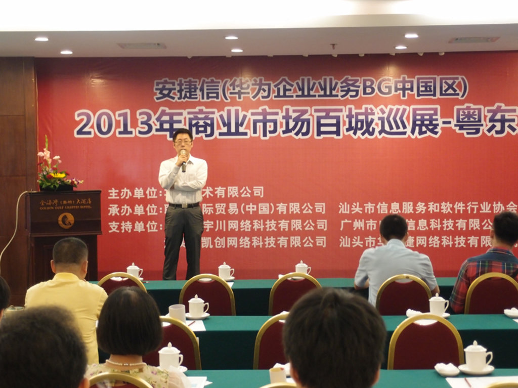 由华为技术有限公司主办,汕头市信息服务和软件行业协会承办的“华为2013商业百城巡展活动粤东站”于7月11日下午,在汕头市金海湾酒店黄金殿会议厅隆重召开。本次活动共有近60名嘉宾出席。