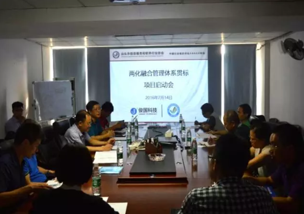2016年7月15日下午,为进一步推进两化融合工作,提升企业的经营管理水平,推进互联网+的战略进程,汕头市俊国机电科技有限公司举行两化融合管理体系贯标项目启动会。汕头市经济和信息化局李俊副局长、郭鹏程科长、汕头市信息服务和软件行业协会刘向民会长、协会“两化融合”服务咨询专家、俊国科技总经理罗俊生先生及各部门主管等参加了会议。