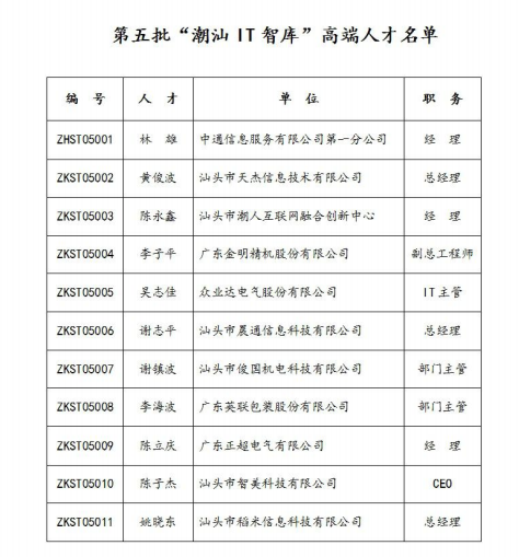潮汕IT智库——在市委市政府、市经济和信息化局、市科学技术协会等的大力支持下,由汕头市信息服务和软件行业协会发起,联合汕头、潮州、揭阳三市六个IT协会,共同打造粤东现代信息服务业人才资源运营平台。截至目前,专家库共有290名。